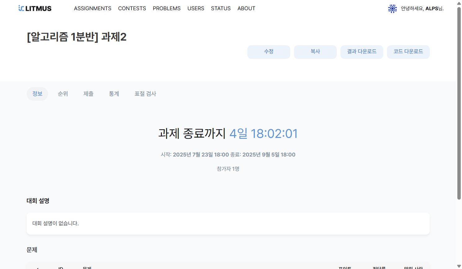 설명: 과제/대회에 대한 상세 설명을 작성하는 부분입니다. 목적, 규칙, 유의사항 등을 기재할 수 있습니다.
