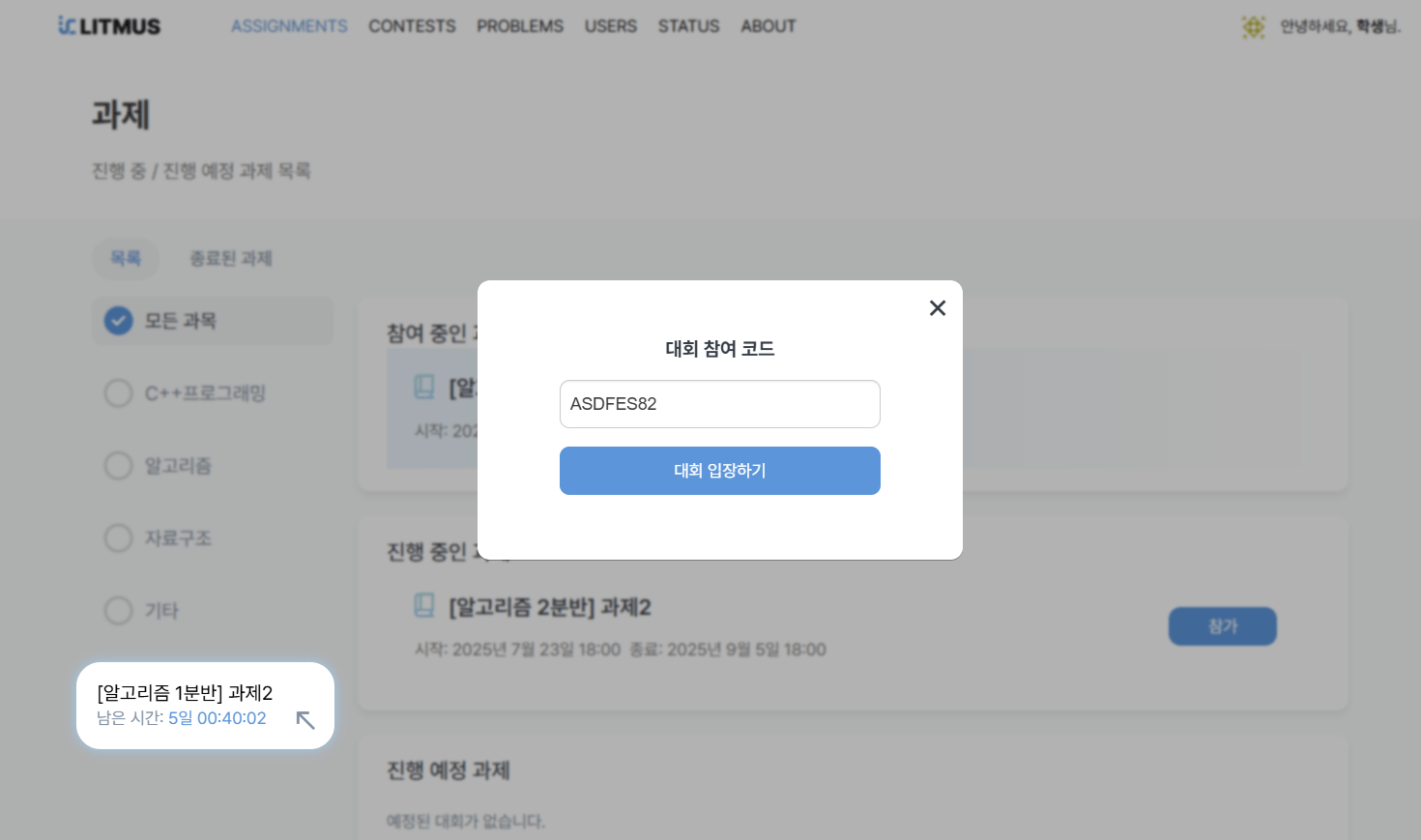 교수님 또는 학과에서 받은 과제/대회 참여 코드를 통해 과제나 대회에 참가할 수 있습니다.