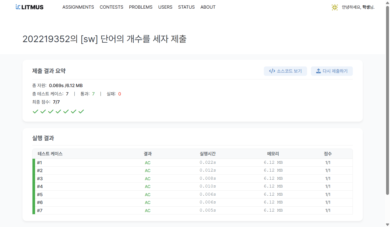 - 제출 목록에서 각 제출의 '보기' 버튼을 누르면 채점 상세 정보를 확인할 수 있습니다.