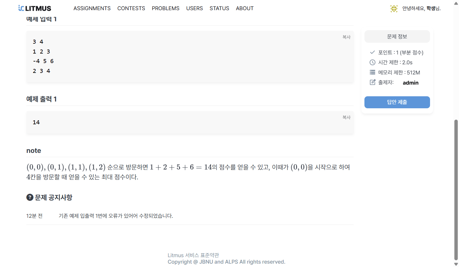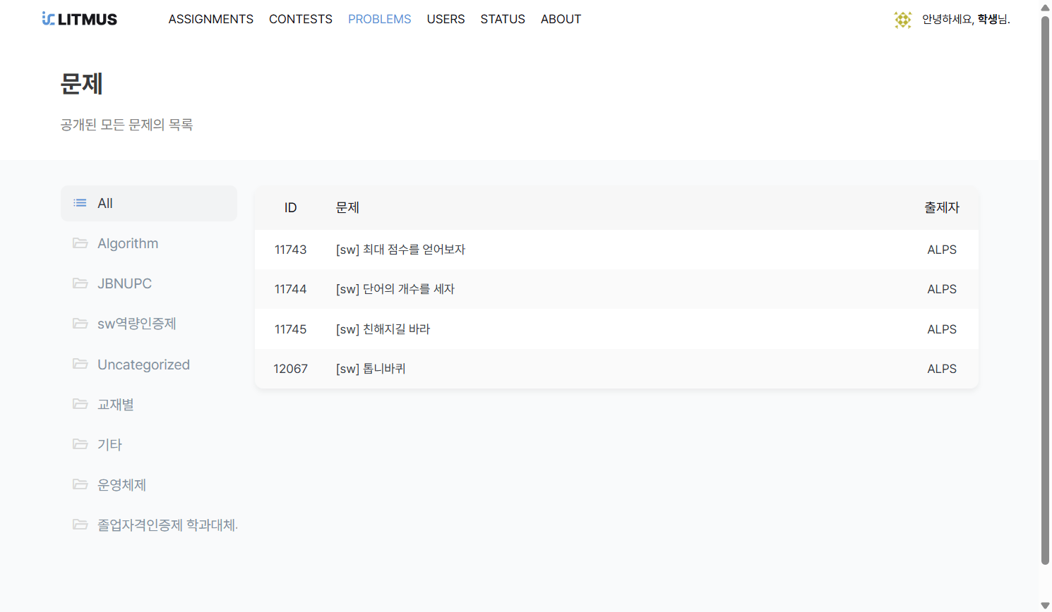 - 문제 목록: 참가 중인 과제/대회의 문제나 공개된 문제를 확인할 수 있습니다. 공개된 문제는 PROBLEM 탭에서 확인할 수 있습니다.